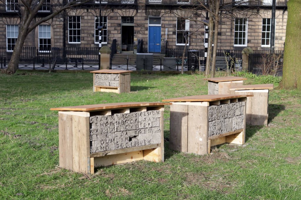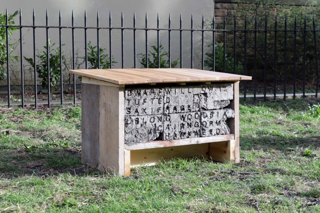 Across Scotland we have identified 5 key habitats at risk: Woodland, Marine, Fresh Water, Moorland & Mountain. Each habitat is memorialised by a corresponding bench and waymark pair. Inscribed into each bench are the names of the species that reside in the given habitat: Capercaillie, Snow Bunting, Atlantic Salmon, Whorl Snail, Sand Deceiver and many others, each remembered through the act of casting their name in earth. From each bench you face a waymark, informing you which habitat these beings reside in and orientating you towards them. The waymarks form a set of ‘playful furnitures’ that prompt new interactions, allowing participants to re-imagine their relationship to the cathedral grounds.