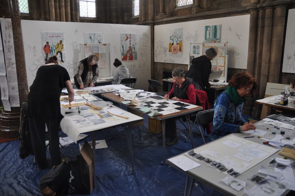 Linocuts inspired by living leaves and the stone foliage carved into the fabric of the Cathedral, October 4th and 5th