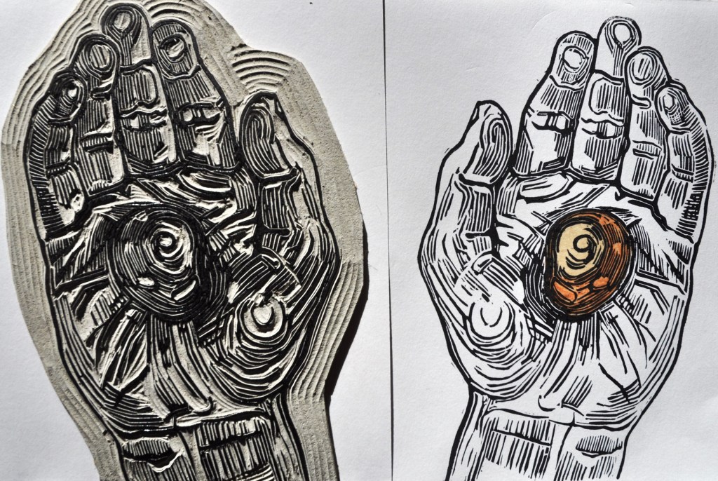 Carrying a Kernel of Hope into the Winter: making linocut prints using the reduction-cut method, inspired by the form and energy of tree seeds.